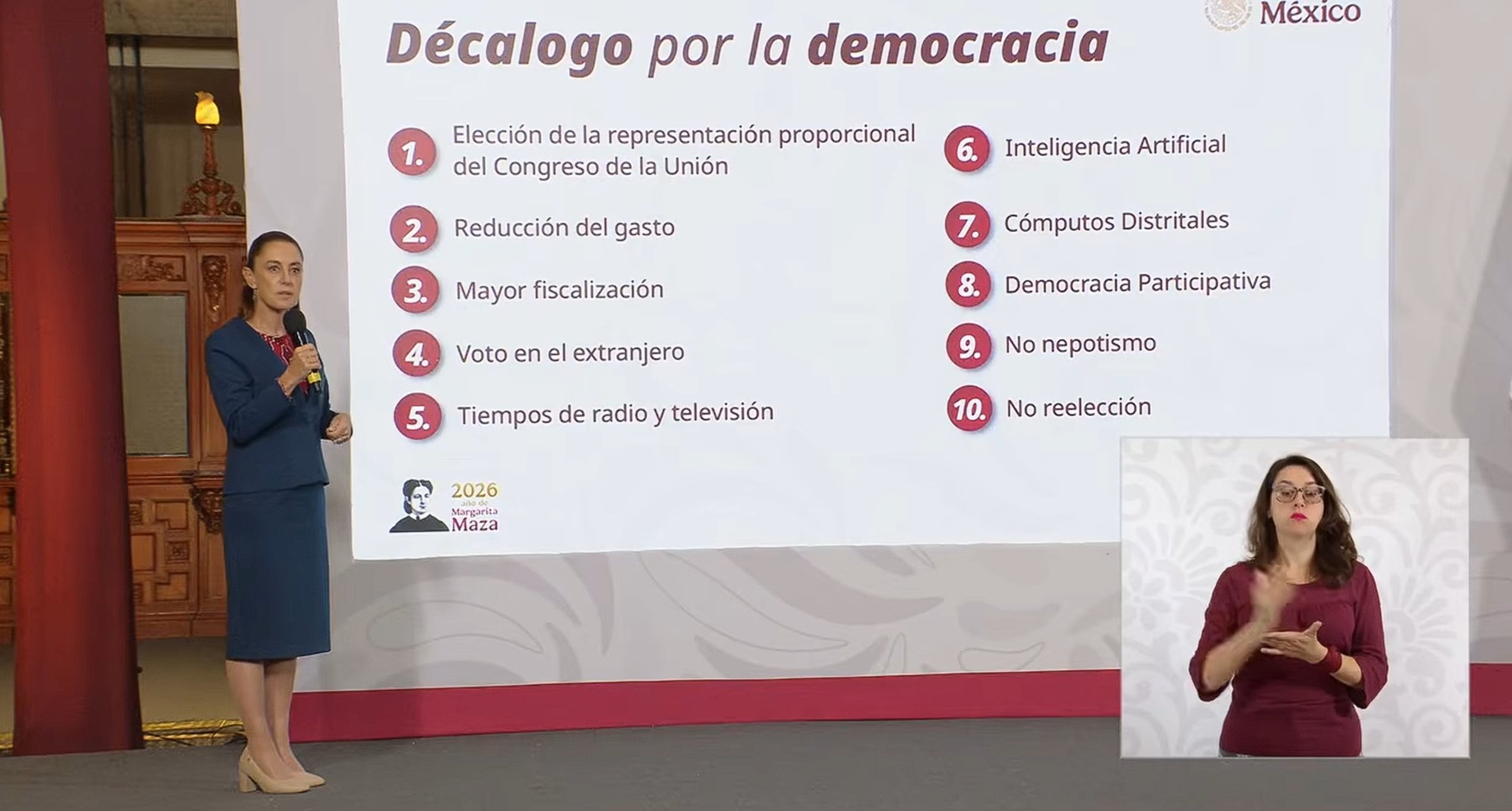 Durante la conferencia matutina en Palacio Nacional, la mandataria explicó que el decálogo reúne los principales ejes que busca modificar en el sistema electoral mexicano y que la propuesta será enviada para su análisis en el Senado de la República.