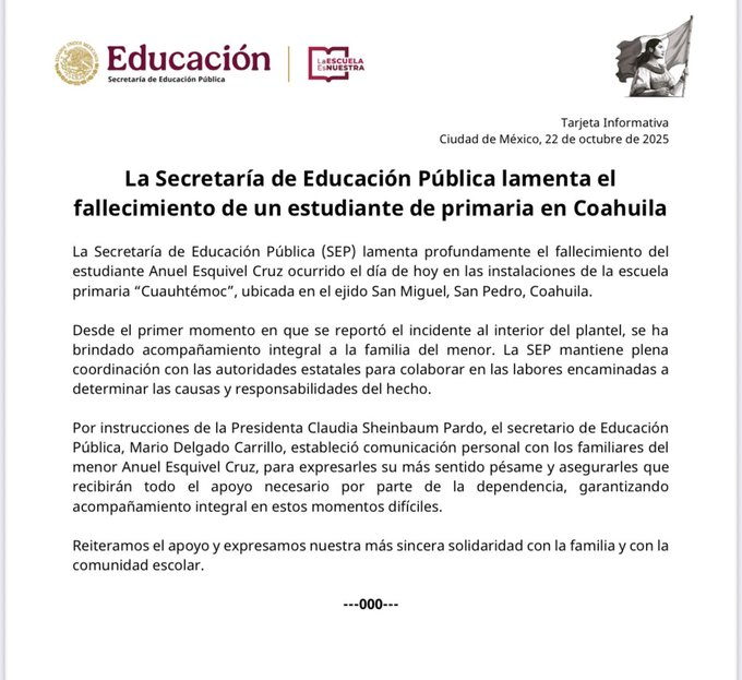 Pese a la magnitud del hecho, la respuesta oficial fue mínima. La SEP emitió un breve comunicado en el que “lamenta el fallecimiento del menor”, sin hacer referencia a la empresa contratista, los mecanismos de supervisión ni a las posibles responsabilidades de funcionarios públicos involucrados.