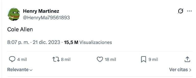 La publicación fue atribuida a una cuenta identificada como @HenryMa79561893, aparentemente creada por un hombre llamado Henry Martinez. Según lo que comenzó a difundirse después del ataque, el perfil no tenía biografía, usaba una imagen de Pepe the Frog y llevaba más de dos años sin actividad. Además, solo mostraba una publicación visible: ese mensaje del 22 de diciembre de 2023 con el nombre de Cole Allen, sin contexto, explicación ni referencia adicional.