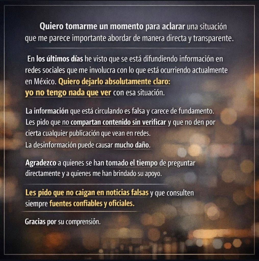 “En los últimos días he visto que se está difundiendo información en redes sociales que me involucra con lo que está ocurriendo actualmente en México. Quiero dejarlo absolutamente claro: yo no tengo nada que ver con esa situación”, escribió.